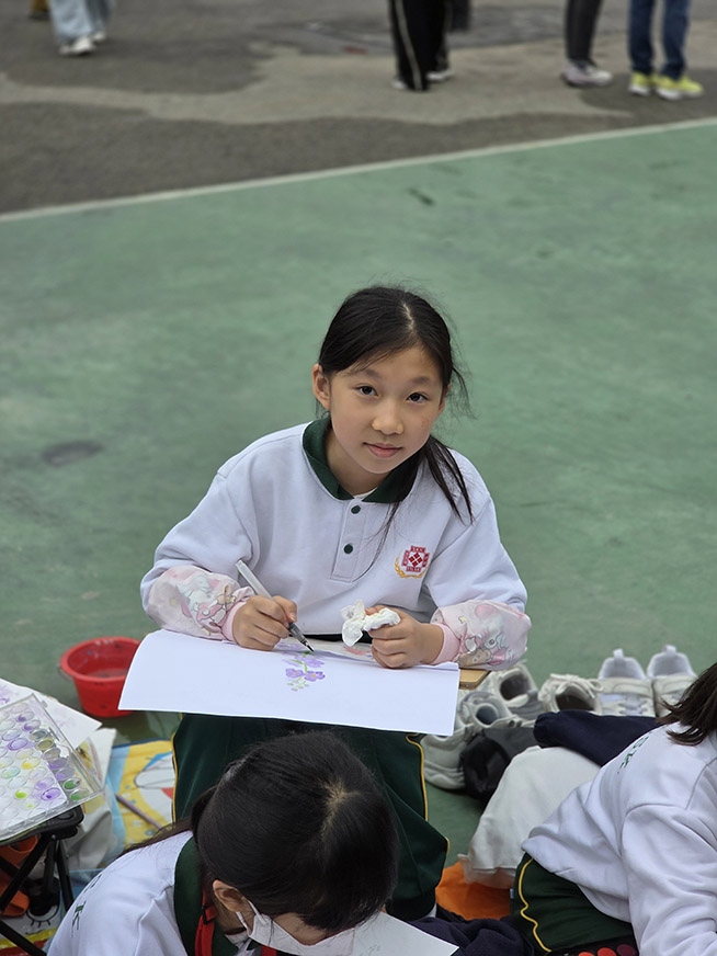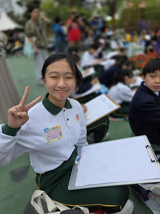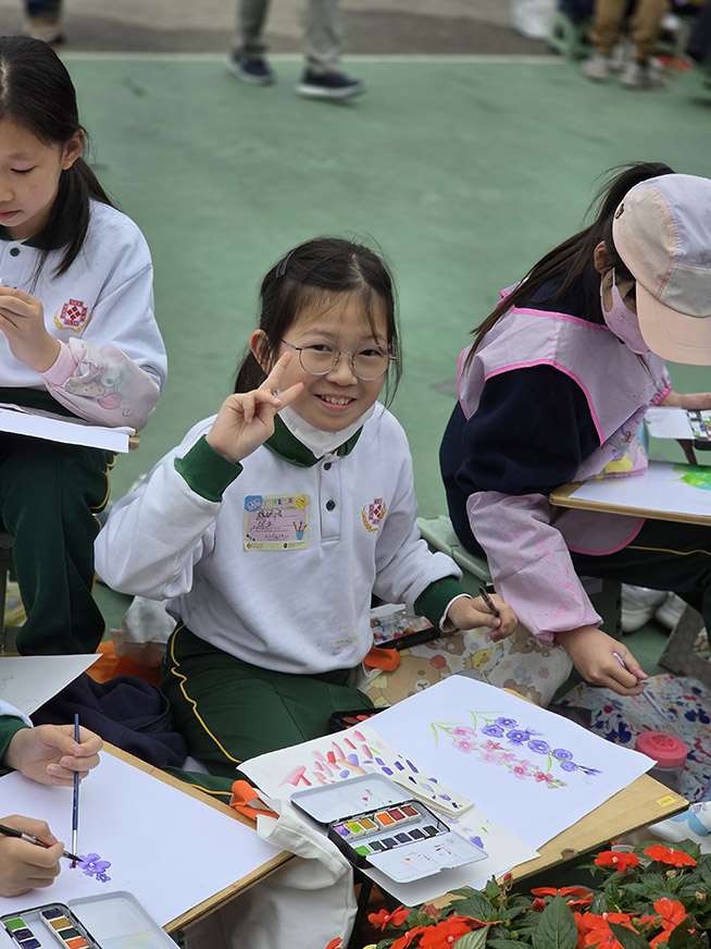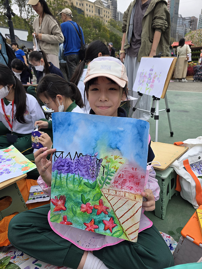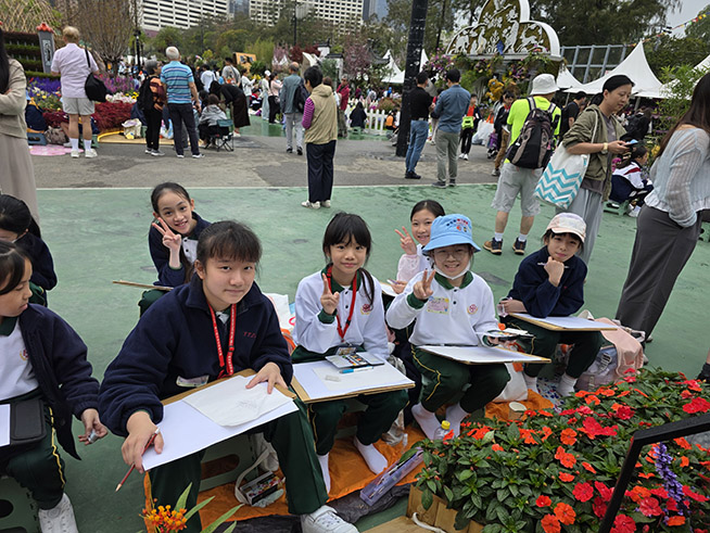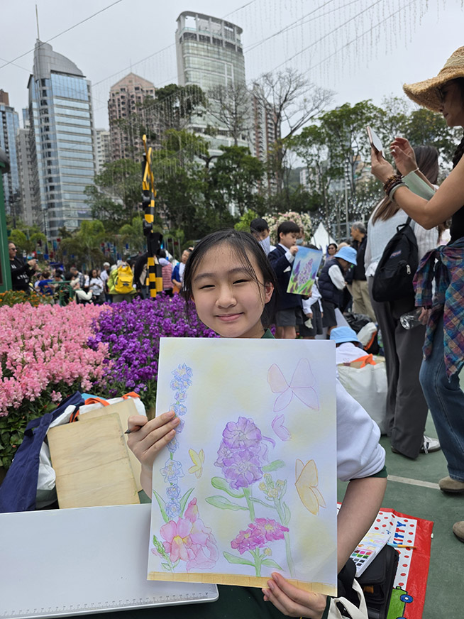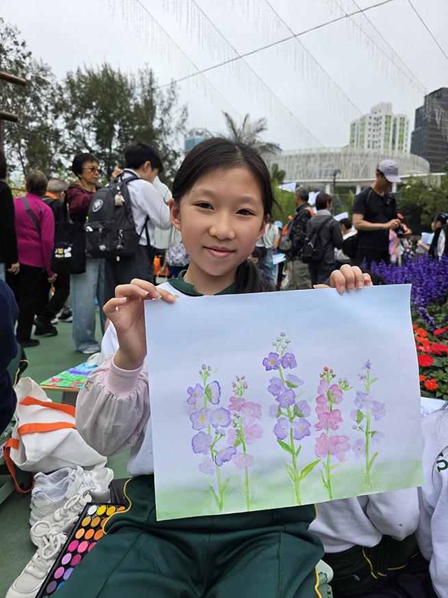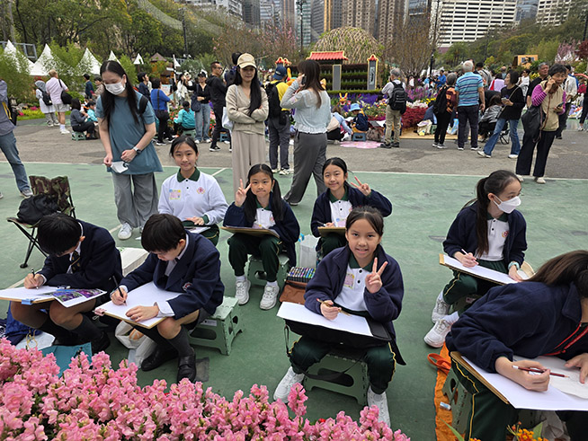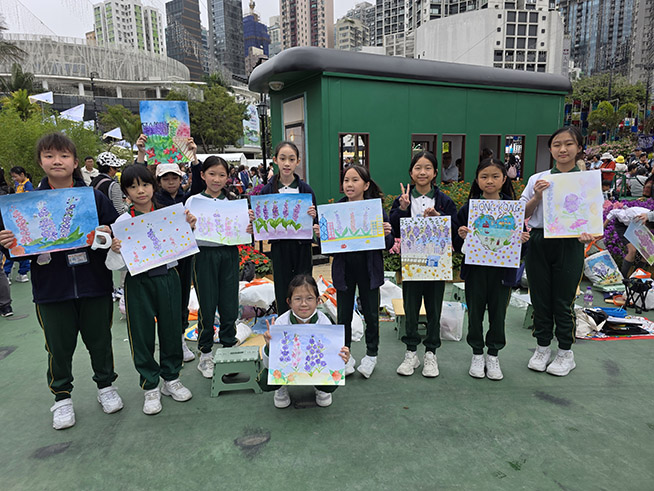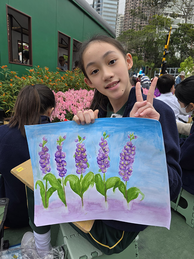 本校五、六年級十位學生參加了由康樂及文化事務署舉辦的二零二六年香港花卉展覽--賽馬會學生繪畫比賽。今屆花展以紫羅蘭為主題花,並以「花語尋『香』— 細味城市特色」為主題。紫羅蘭幽香馥郁,色彩斑斕,在繁華都市一隅悄然綻放,同學在一片花海中繪畫,樂在其中。